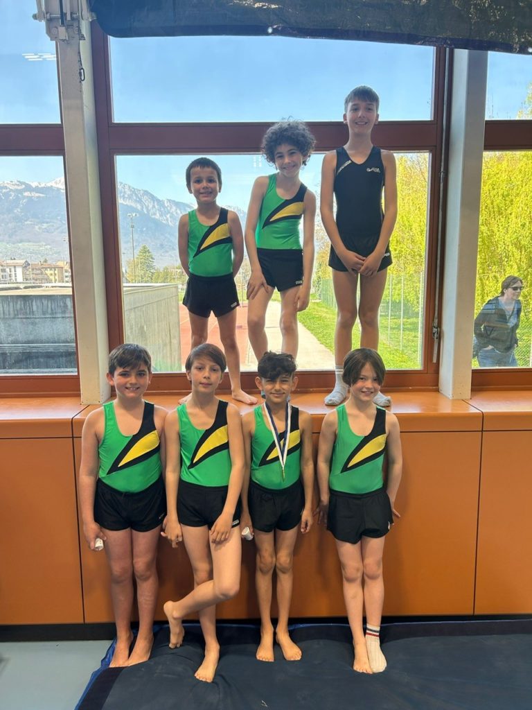 Groupe de gymnastes filles et garçons aux agrès individuels participant aux compétitions régionales, cantonales et nationales.